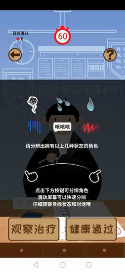 检疫60秒游戏玩法十分简朴,只需要通过简朴的识别人物特征及对话,为出现在你面前的角色通过滑动或点击做出初步的判定。我们团队是一间通过爱好而组建起的小游戏工作室,希望通过这个小游戏,我们也能以游戏玩家与游戏业者的身份为这场战斗尽到我们的一份力量!加油中国!