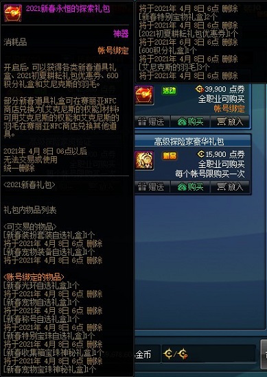 不过玩家倒是可以参考和查看2021年的春节套装,从而来猜测一下今年会有什么内容。可能会有新春装扮套装自选礼盒、新春宠物装备自选礼盒、新春光环自选礼盒、新春宠物自选礼盒、新春称号自选礼盒、新春特殊宝珠自选礼盒、新春收集箱宝珠自选礼盒、新春宠物宝珠神秘礼盒、新春特殊宝物礼盒以及dnf2022年初夏优惠券等。