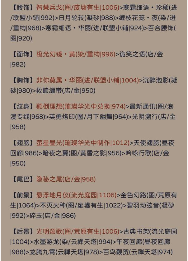 1.发型:乘风万里(套装成就/璀璨华光中兑换|6605)崭新纪元(套装成就/图/废墟有生|6560)沉静风浪(璀璨华光中制作|6510)魅惑佳人·终章(染/进/图/莉莉斯有生|6500)无尽风雨(璀璨华光中兑换|6455)可可慕斯·华丽(进/联盟小铺|6240)黑白命运(图|6145)