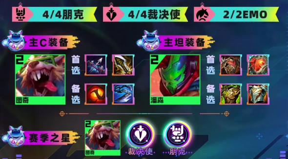 2、阵容羁绊:4朋克4裁决战士2护卫2EMO