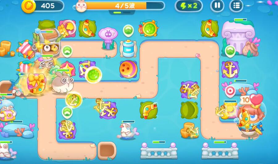 3、在左上角建造鱼雷塔对水下的兔子进行攻击,建造水雷塔,对经过的敌人造成伤害,随后在左下方建造飞镖塔清理左侧的大型障碍物。