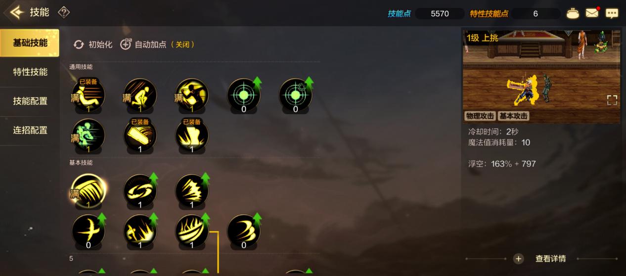 技能界面中,分别有技能加点的基础技能与特性技能、技能位置选择的技能配置及最重要的连招配置。