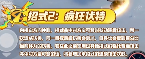 向指定方向冲刺,招式命中对方金可梦时发动连续攻击,第一次造成伤害,同一目标后续伤害会衰城,自身也会受到百分比当前体力的伤害。