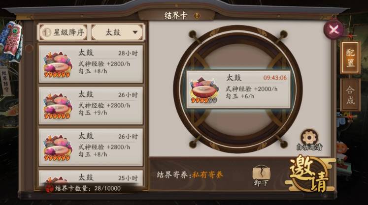 结界卡常常产生大量一级卡,三个一级卡合成有可能得到二级或三级卡。通常用三个二级卡合成,有机会得到三级或四级卡。一旦合成三级卡,我便保留使用。最高每小时可产出6枚勾玉,但这种情况出现的概率并不高。